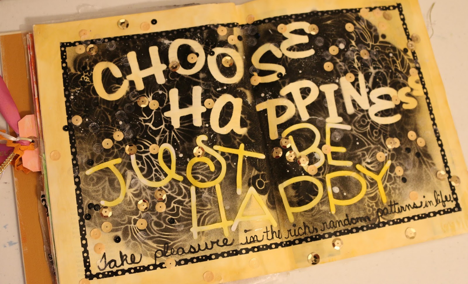 | For prompt #3, I used the quote, listened to the talk on happiness, and used the suggested techniques of randomness and graffiti. This is about as close as I could get to graffiti LOL. |